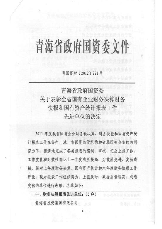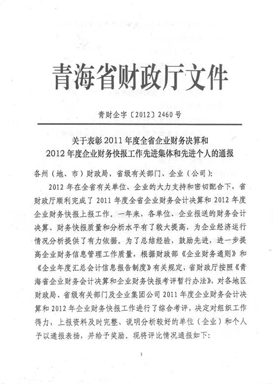 2012年,在集團及所屬各公司領(lǐng)導(dǎo)的高度重視下,在所屬各公司的大力支持和密切配合下,在辛勤工作在財務(wù)會計崗位上的同事們的共同努力下,集團總公司圓滿完成了省國資委和省財政廳各類報表的上報工作,財務(wù)信息工作質(zhì)量、時效性和財務(wù)分析水平都比上一年度有所提高,受到了省國資委和省財政廳的好評,集團總公司2011年度財務(wù)決算工作被省國資委評為先進單位,集團財務(wù)審計部張莉青同志被省財政廳評為2012年度財務(wù)快報工作先進個人。